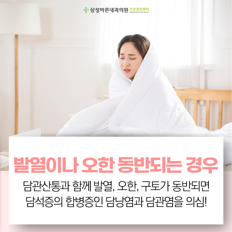 발열과 오한이 동반되는 경우는 담관산통과 함께 발열과 오한, 구토가 동반되는 경우 담석증의 합병증인 담낭염과 담관염이 의심될 수 있습니다. 증상이 있다면 빨리 병원을 찾아 혈액검사, 초음파검사 등으로 정확한 진단을 확인하는 것이 필요합니다.