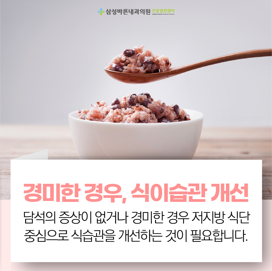 경미한 경우라면 식습관 개선 담석의 증상이 없거나 경미한 경우라면 저지방 식단을 중심으로 식습관을 개선하는 것이 필요하며 과식을 피하고 적정 체중을 유지하기 위한 노력이 중요합니다. 또한 정기적인 진료를 통해 상태를 점검할 필요가 있는 것입니다.