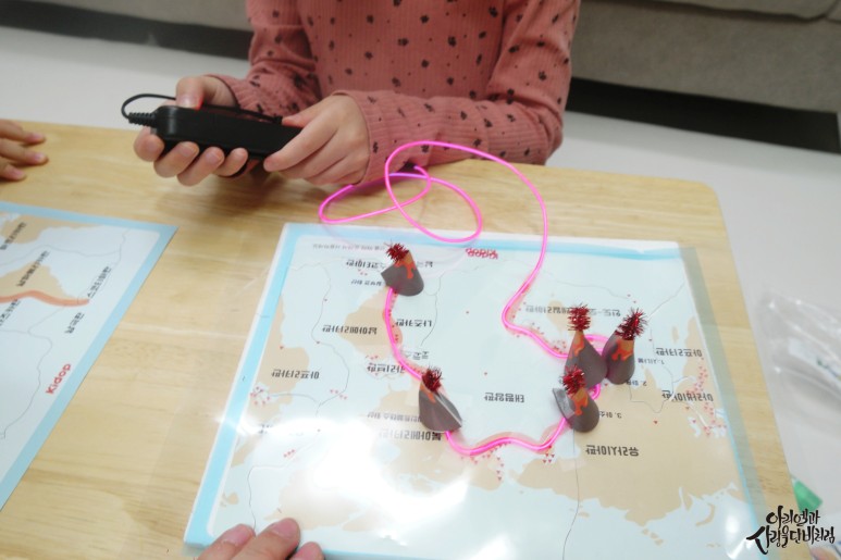 평소에 잘 접하지 않던 도구인 ohp필름, 압정, 네온선 등을 접하면 너무 신기하고 좋아했어요