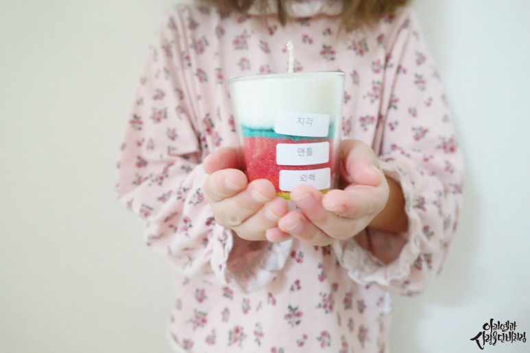 녹인 초를 붓고 굳을 때까지 기다리면 끝!만들면 밤이니까 촛불도 켜보고 아이들이 정말 활동하면서 신나고 즐거워하는 걸 봤어요.그리고 자녀에게 지식도 쌓게 해줍니다.