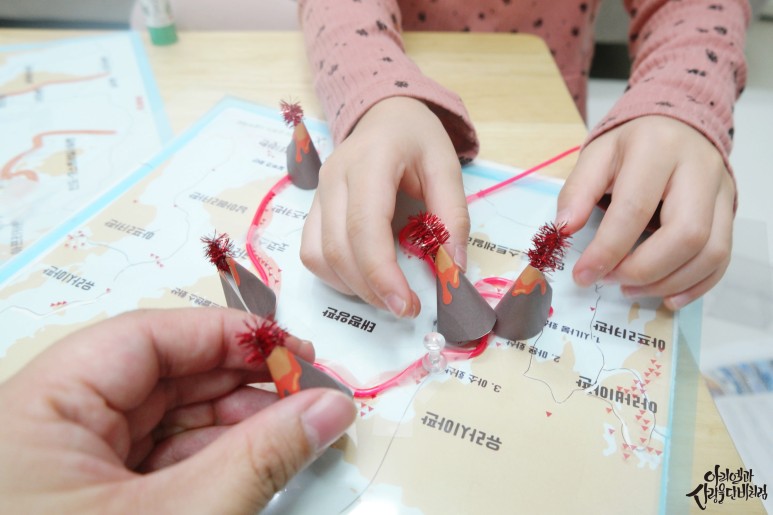 이게 불의 고리라고 설명해 주시면서 굉장히 신나게 하고 있는 아이!사실 초등학교 저학년까지 책에 나온 내용들이라 어느 정도 받아들여질까 했는데 활동 자체가 너무 즐거워서 이렇게 하나하나 만들고 활동하면서 더 쉽고 재미있게 받아들이고 알게 된 것 같습니다.