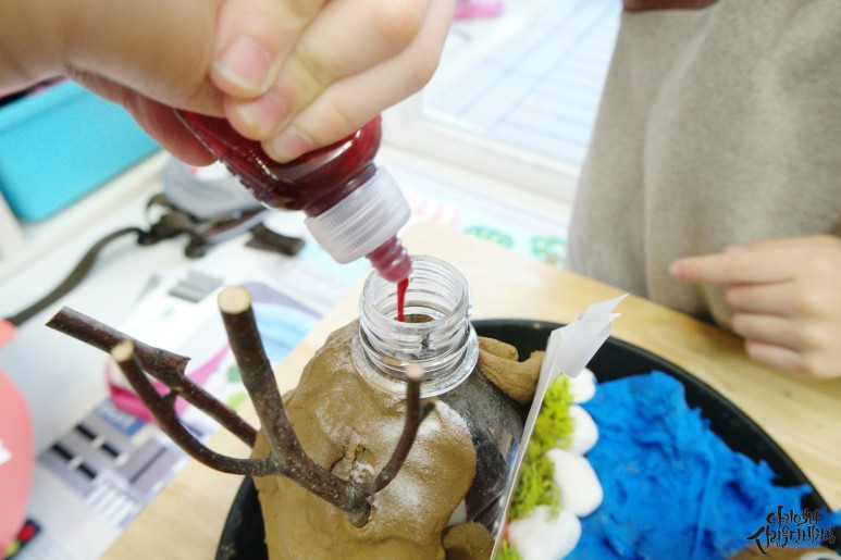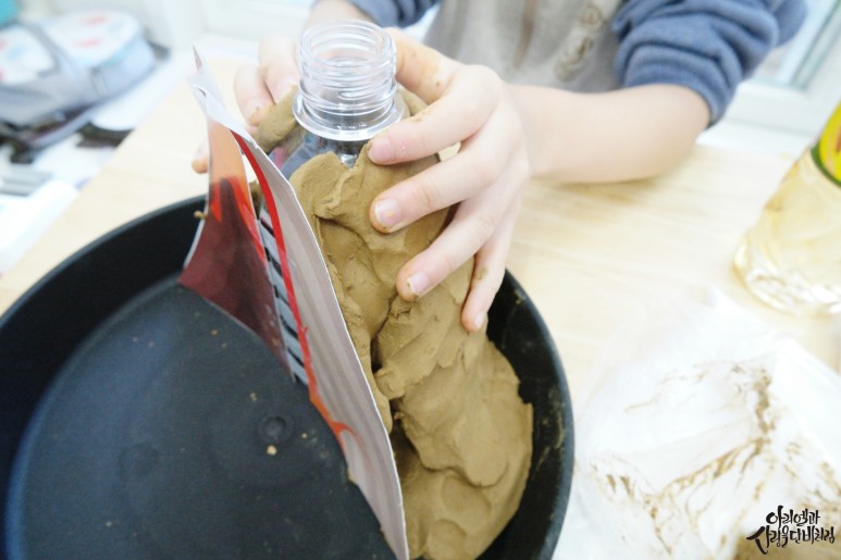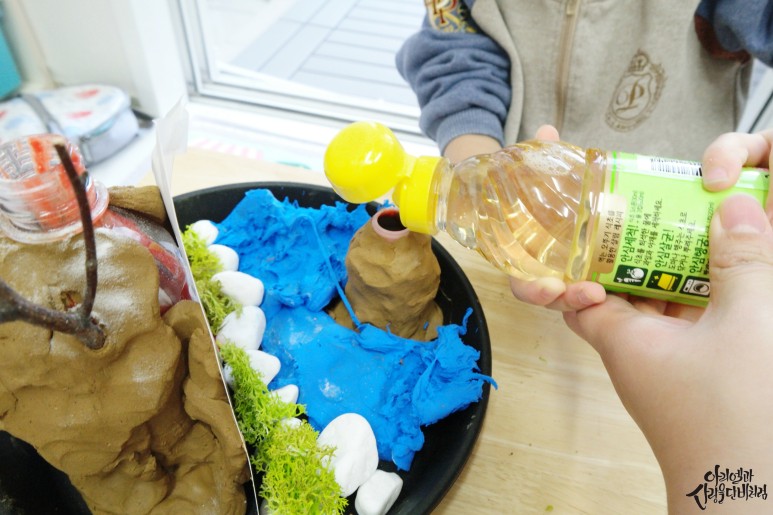 산 사이로 보글보글 올라오는 모습을 관찰하면서 마그마가 땅을 뚫고 이렇게 흘러나온대! 그러자 아이가 정말 재미있게 놀면서 과학활동을 하더라구요.