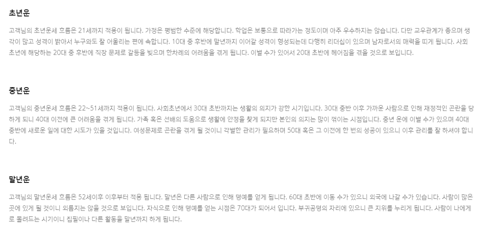 아래로 조금 내려가 보면 초년운 중년운처럼 나뉘어 운세를 볼 수 있습니다.