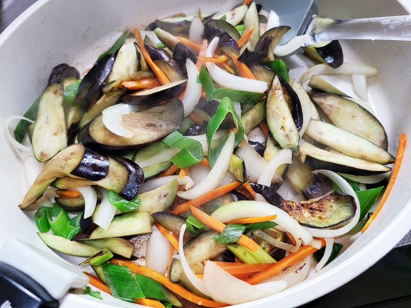 가지를 굽듯이 갈색이 되도록 양념장을 넣기 전에 계속 볶아서 수분을 날려버립니다.