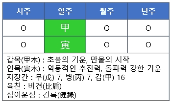 일지건록을 가지고 있으며 일저에서는 매우 발달하여 매사에 잘 되는 편이지만 상하 모두 목 상태로 형성되어 있어 근본적으로 불안증 또는 마음의 장애가 동반될 수 있습니다. 간여지동 일주는 밖에서는 호인이 많지만 집에서는 배우자에게 유독 고집이 세서 다툼이 잦아지거나 결혼이 늦어지는 경우가 많습니다.*간여지동은 천간과 지지의 오행이 서로 같은 경우를 말합니다.*간여지동을 가진 일주
