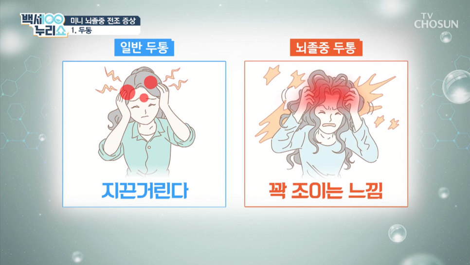 출처 : TV조선 백세누리쇼 1. 두통 미니 뇌졸중 전조증상 중 두통은 혈관이 막혀 피가 통하지 않기 때문에 일반 두통과 달리 꽉 조이는 느낌이 든다고 합니다.
