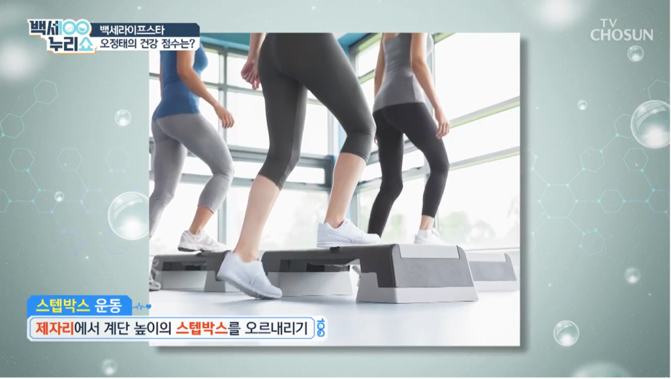 출처 : TV조선 백새누리쇼 스텝박스 운동이란 딱딱한 상자나 계단높이의 스텝박스를 놓고 한발씩 오르내리는 운동입니다.유산소 운동도 좋고 하체의 근력 유지에도 매우 좋습니다.
