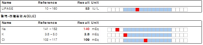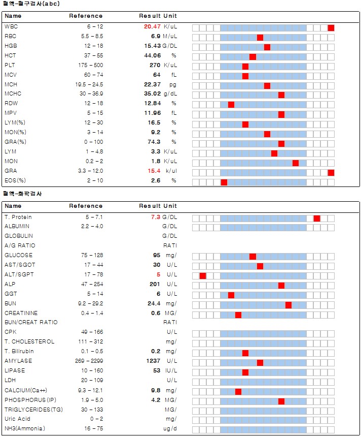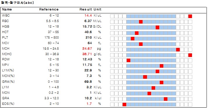 혈액 검사에서는 염증 수치가 상승한 것 이외에는 별다른 소견이 없었습니다.