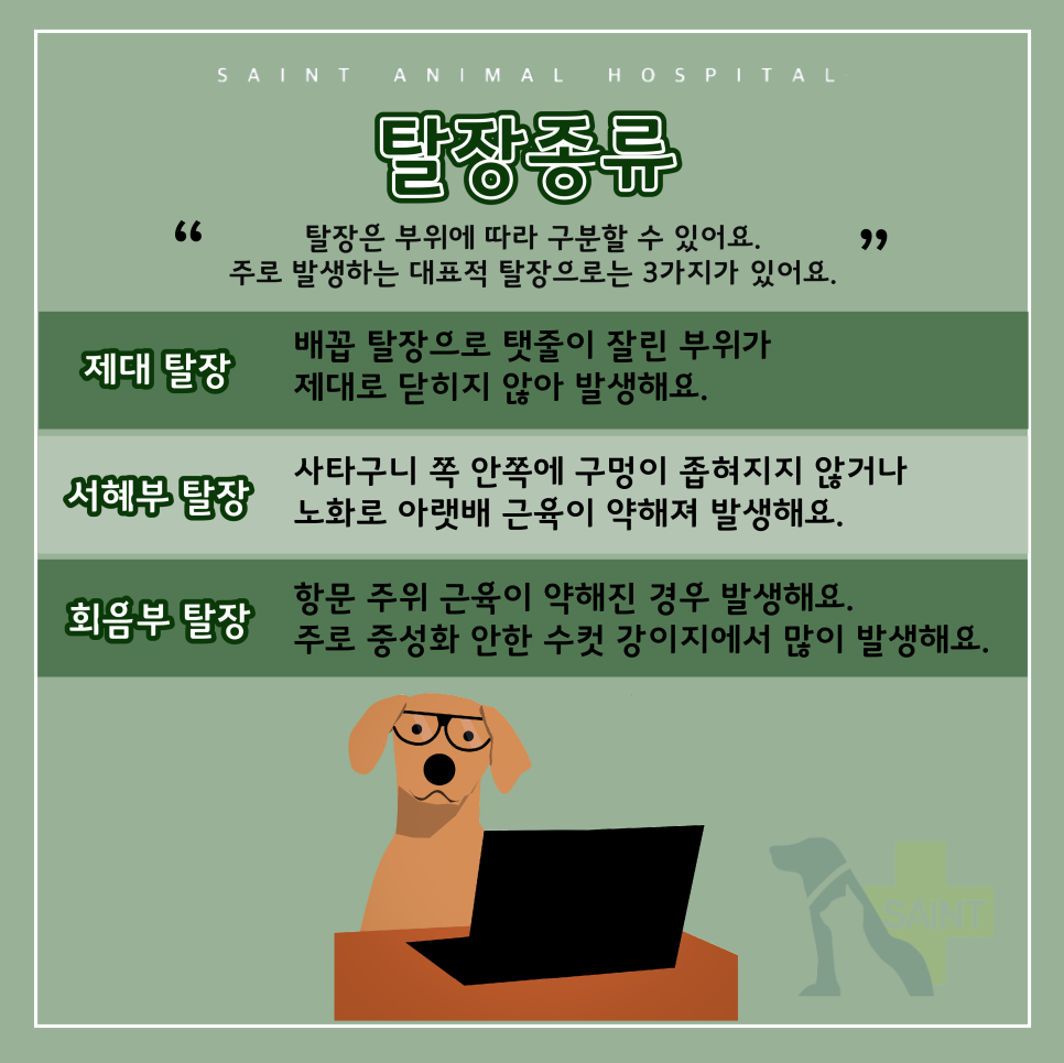개의 탈장은 처음 언급했지만 매우 흔한 문제입니다.그러나 꿈*처럼 쉽지 않은 상황이 발생할 수도 있으므로 갑자기 항문 주위나 가랑이 배꼽 주위에 무언가가 부풀어 오르면 지체되어 조직의 괴사를 동반한 심각한 상태가 되기 전에 꼭 동물병원에 내원하여 진료 및 상담을 받아보시기 바랍니다.