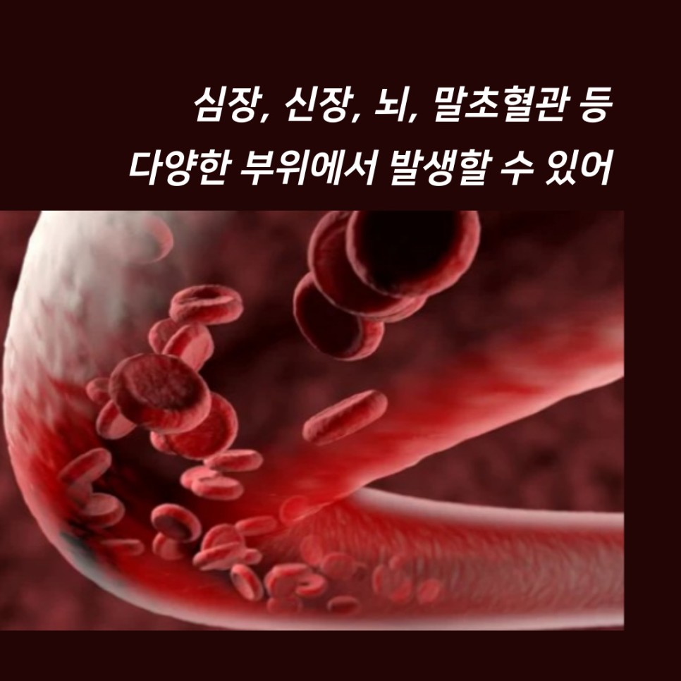 우리 몸에는 수많은 혈관이 있는데 혈관을 통해 혈액, 산소, 영양소가 손끝, 발끝까지 도달합니다. 그러나 노화는 물론 다양한 원인에 의해 이러한 혈류의 흐름에 방해받는 상황이 발생할 수 있는데, 수도관 내부에 녹이 슬거나 이물질이 달라붙어 물의 흐름을 방해하는 것에 비유할 수 있습니다.혈중 콜레스테롤, 중성지방 수치가 높아지면 혈관 안쪽의 내막에 지방이 끼어 내피세포가 과도하게 증식하는 등의 이유로 혈관이 좁아져 죽종이 형성될 수 있습니다. 이러한 죽종으로 인해 흐름이 느려진 혈액은 다시 혈전의 형성, 혈관의 완전 막힘 등을 초래하여 혈액순환 장애로 이어질 수 있습니다. 이런 것들을 동맥경화증, 죽상경화증이라고 부릅니다.