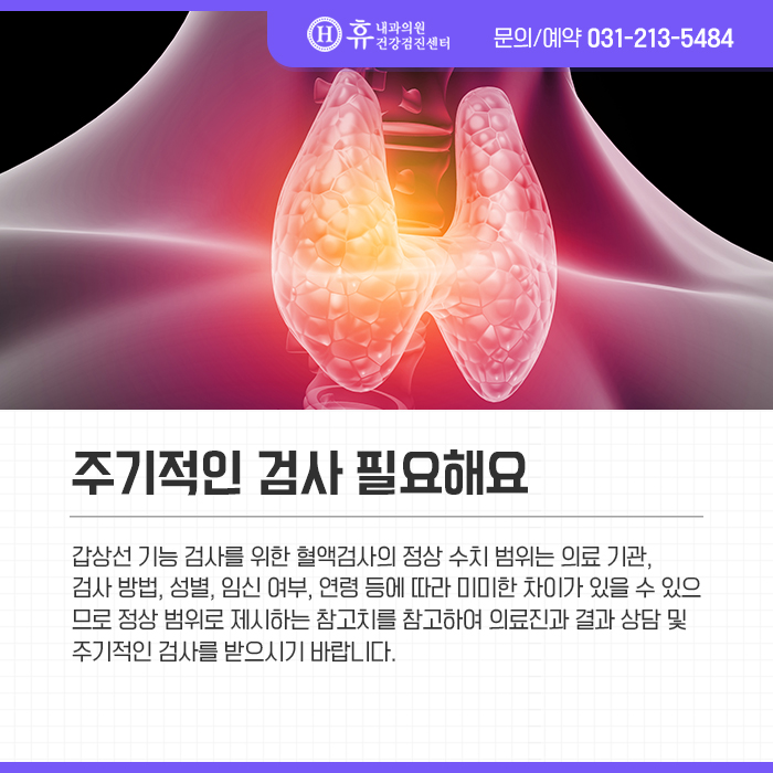 수원야간진료병원 휴내과의원의 갑상선 기능검사를 위한 혈액검사의 정상수치 범위는 의료기관, 검사방법, 성별, 임신여부, 연령 등에 따라 미미한 차이가 있을 수 있으므로 정상범위에서 제시하는 참고치를 참고하시어 의료진과 결과상 및 주기적인 검사를 받으시길 권장합니다.