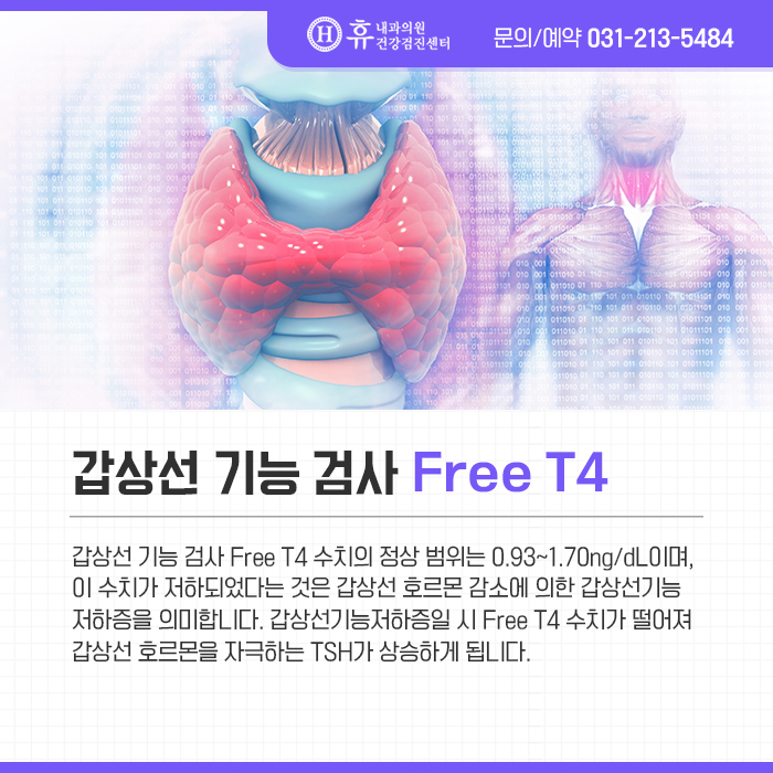 수원야간진료병원 휴내과의원 갑상선기능저하증 검사 FreeT4 갑상선기능검사 FreeT4 수치의 정상범위는 0.93~1.70ng/dL이며, 이 수치가 저하되었다는 것은 갑상선호르몬 감소로 인한 갑상선기능저하증을 의미합니다.
