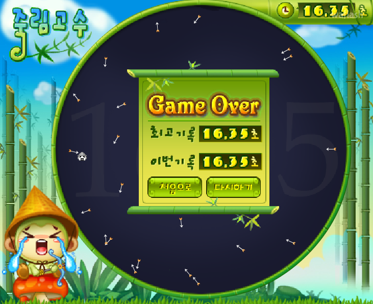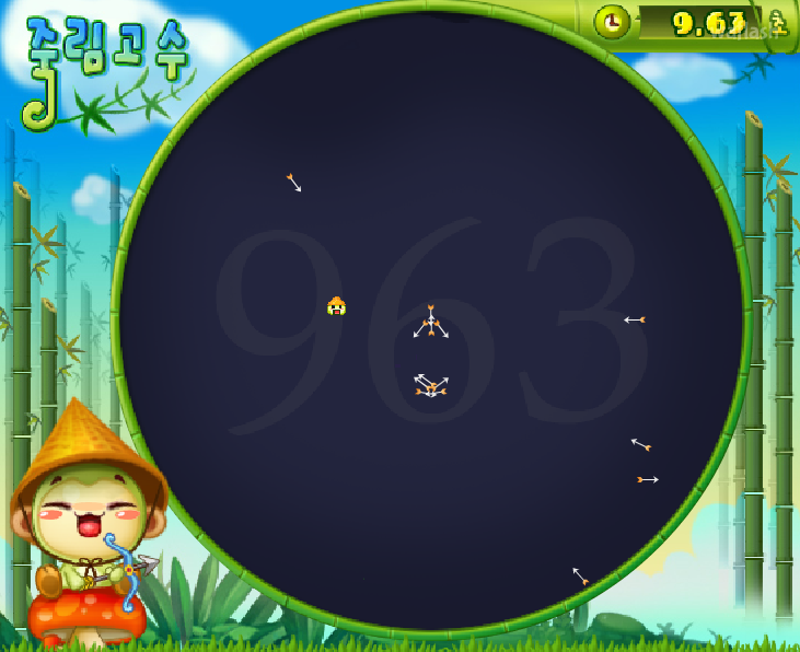 부활은 없고 화살촉에 맞으면 곧바로 쓰러집니다. 즉, 얼마나 오랫동안 피할 수 있는지를 겨룰 수 있습니다. 일정한 시간 간격과 움직임으로 날아오기 때문에 패턴을 파악하는 탄막 회피 플래시 게임이라고 할 수 있습니다. 들리는 말로는 50초를 견디기까지 1시간 이상 걸린 등 강한 중독성을 가지고 있어 많은 사용자들이 대나무 숲의 달인을 즐기고 있다고 합니다.