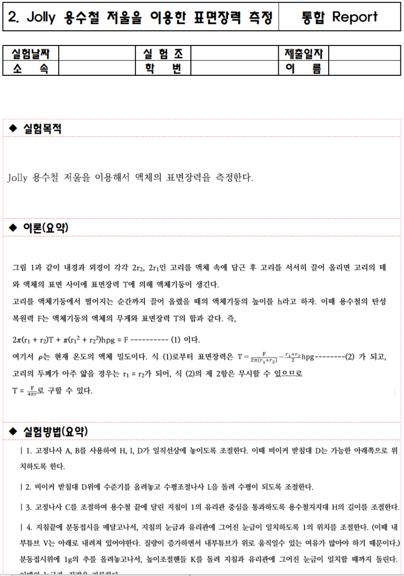 결과 리포트 다운로드 표면 장력 측정-Jolly스프링 스케일.DownLoad파일 자료. zip결과 리포트 다운로드 표면 장력 측정-Jolly용수철 저울. 1. 실험 값 „. 질문 사항…토의 FileSize:54K1. 실험 값 „. 질문 사항…토의의 사실 이번 실험에서는 예습을 철저하지 않았다. 매번 말처럼 실험에서 예습은 결과치에 큰 영향을 미친다. 이번 실험에서는 부족한 예습이 정확한 실험이 못한 최대 요인이었던 것 같다. 이번 실험에서 다시 한번 예습의 중요성을 절실히 깨닫고 다음 실험에서는 보다 충실하게 하는 것을 다짐한다. 또 마지막에 표면 장력의 단위에 대한 사전 지식을 미리 준비했다면 보다 큰 도움이 됐을 것이라는 아쉬움이 남는다.자료 출처:https://www.ALLReport.co.kr/search/Detail.asp?xid=a&kid=b&pk=10952982&sid=tjr6155&key=[문서 정보]문서 분량:3Page파일 종류:HWP파일 자료 제목:결과 리포트 다운로드 표면 장력 측정-Jolly스프링 스케일. 파일명:물리 실험-리포트 19.hwp키 워드:결과 리포트, 물리학 실험 물리 실험, 표면 장력 측정, jolly물 철칭, 다운로드, 표면 장력 측정, Jolly, 물 같은 자료 No(pk):10952982