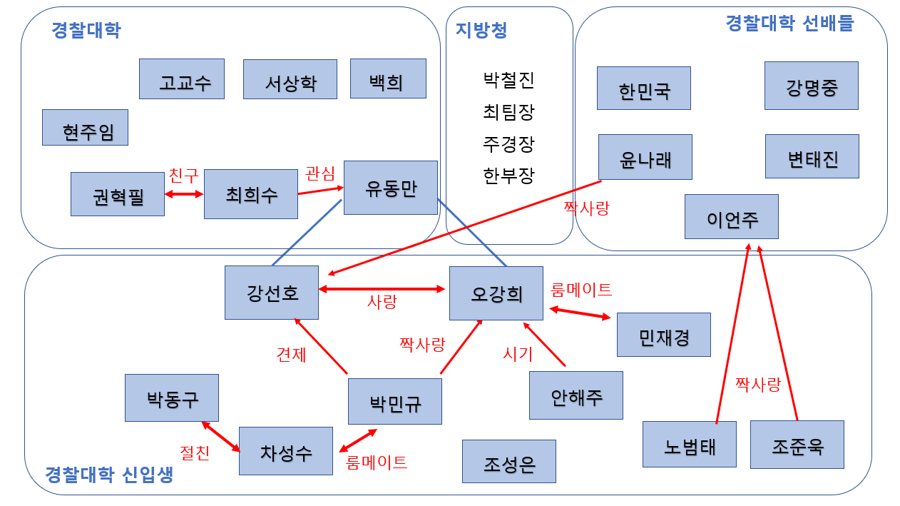 경찰 수업 민재경(여21세) cast. 박승연 경찰대 1학년 신입생+강희 룸메이트 자신의 이야기를 함부로 떠들지 않는 개인주의자. 관심이 없는 것 같으면서도 한 발짝 떨어져 큰 그림을 보는 인물이다. 두꺼운 벽이 있는 느낌인데 한번 마음을 주면 끝까지 주는 표차의 내용물 시범.재수 끝에 들어온 경찰대졸업 후 과수대학에 들어가는 것이 목표여서 과학수사연구회에 가입했다. 동아리 담당 교수인 상학과 친하게 지내고 잘 따른다.