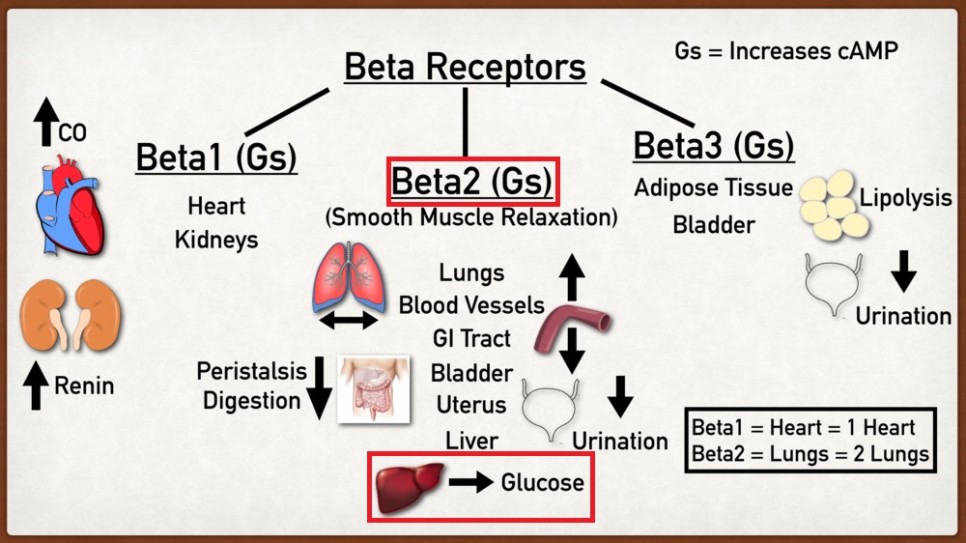 알파 작용은 여기에서는 말하지 않고 베타에 대해 이야기 해 보면 베타 1은 심박수를 올리고 심장 수축력을 강하게 하여 혈압을 올리도록 합니다.그리고 신장에서 renin 분비를 올려 혈압을 높입니다.베타2는 평할근에 알파1처럼 존재하며 작용은 알파1과 달리 혈관을 이완시킵니다.즉 혈압이 떨어지게 됩니다.