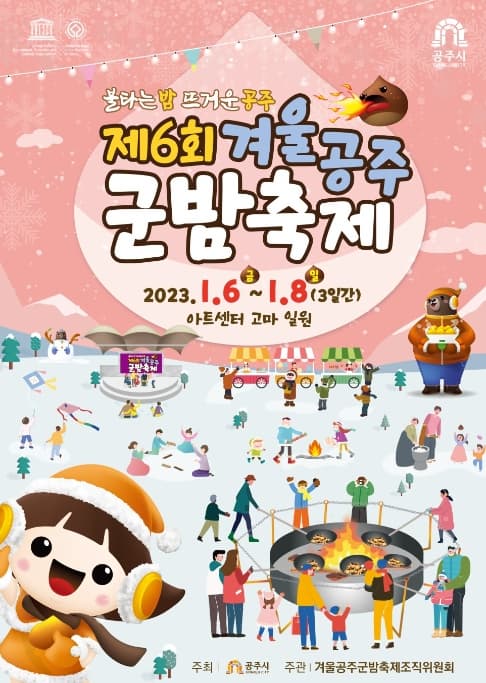 군밤을 판매하는 부스들은 생밤을 판매하지만 농가만의 군밤 기계로 군밤을 구워 판매하고 있습니다. 전문가 굽는 군밤은 군밤 기계 내부 온도까지 측정하면서 정성스럽게 굽네요.밤과 군밤을 판매하는 부스도 있고 밤을 원료로 한 가공식품과 음식, 그리고 지역 특산품을 만날 수 있는 곳도 있습니다.이 부스는 손님이 많이 몰리고 있는데 사실 밤빵을 만들고 있네요. 빵틀에 밤 반을 넣고 반죽을 넣어 만드는데 맛있어요.부스를 지나면 공주 밤을 홍보하는 홍보관이 있습니다. 안에 들어가면 공주 밤뿐만 아니라 밤에 대한 여러 가지 이야기가 담겨 있습니다. 고생하고 있는 자원봉사자도 있고홍보관 옆에는 어린이들의 놀이시설이 설치되어 있어 많은 어린이들의 부모들이 지켜보는 가운데 놀이를 즐기고 있습니다.어린이들의 체험놀이가 있는 곳에 오면 한국의 전통놀이를 설명해주는 한국전통놀이연구보급회 회원들이 놀이기구 설명을 하고 있습니다. 아줌마 체험객들이 신중하게 배우는 모습입니다.체험공간에는 판매처가 있어 체험권을 구입하여 밤 간식 만들기 등 다양한 체험을 즐길 수 있습니다. 엄마와 함께 체험권을 구입하는 아이들이 보이네요.한쪽에는 난타 공연을 준비하면서 관람객을 모으라고 북을 칩니다.제6회 겨울공주 군밤축제를 찾은 관람객들은 군밤을 한 상자씩 사갑니다. 이번 설 선물로 겨울공주 군밤축제 밤을 구입하여 선물하기 좋습니다. 축제장 내 고마나루시장에서는 설 선물세트를 20% 할인된 가격에 판매했습니다.푸드트럭존에서 내려본 공주 군밤축제장 모습입니다. 금요일 오후이지만 매우 많은 관광객이 방문하여 성황을 이루고 있습니다. 지금 아내가 군밤 굽는 곳으로 돌아갑니다.군밤을 잘 구우셨네요. 군밤은 뜨거운 불에 구워야 제맛이에요. 뜨거운 불에 껍질이 익을 정도로 단시간에 구워주고 껍질이 익었다고 안까지 타는 건 아니거든요. 익은 군밤 껍질을 벗기고 내용물은 봉지에 넣었어요. 이렇게 제6회 겨울공주 군밤축제를 둘러보고 군밤구이 체험도 하며 마무리합니다.2018년 올해의 관광도시, 대한민국 테마여행 10선, 한국관광 100선에 선정된 매력적인 고향 공주! 관광도시 공주에서 겨울축제로 공주 특산품 밤을 이용하여 뜨거운 행사가 열렸습니다. 공주의 밤과 겨울밤 그리고 뜨거운 불이 함께 어우러져 온 가족이 체험하고 즐기는 겨울축제! 놓치신 분들은 내년에 꼭 다시 만나보세요.아트센터 고마 충청남도 공주시 고마명로 90제6회 겨울공주 군밤축제기간: 2023년 1월 6일 ~ 1월 8일까지 3일간 장소: 아트센터 고마 일원 주최: 공주시 / 주관: 겨울공주 군밤축제 조직위원회위 이미지를 클릭하시면 손정연 기자의 글을 더 보실 수 있습니다.위 이미지를 클릭하시면 손정연 기자의 글을 더 보실 수 있습니다.