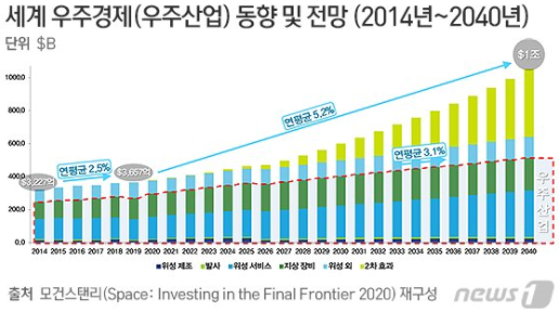 모건스탠리에 따르면 우주산업이 향후 20년간 위성 및 재활용 로켓 수요 급증으로 연평균 3.1%씩 성장해 2040년에는 5137억달러에 이를 것으로 예상된다는 결과가 있었습니다. 이는 곧 인터넷 서비스, 위성TV 등 위성산업 발전에 따른 2차 효과를 포함한 우주경제는 2040년에 1조달러를 넘어설 것이라는 얘기이기도 합니다.
