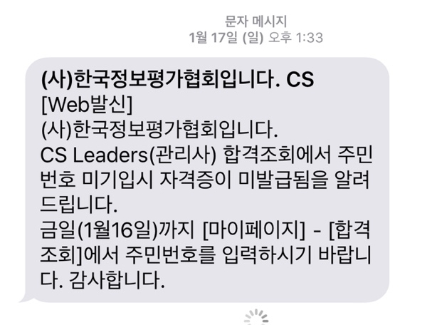 합격 후, 홈페이지에 등록한 주소에 등기로 합격증이 도착합니다.