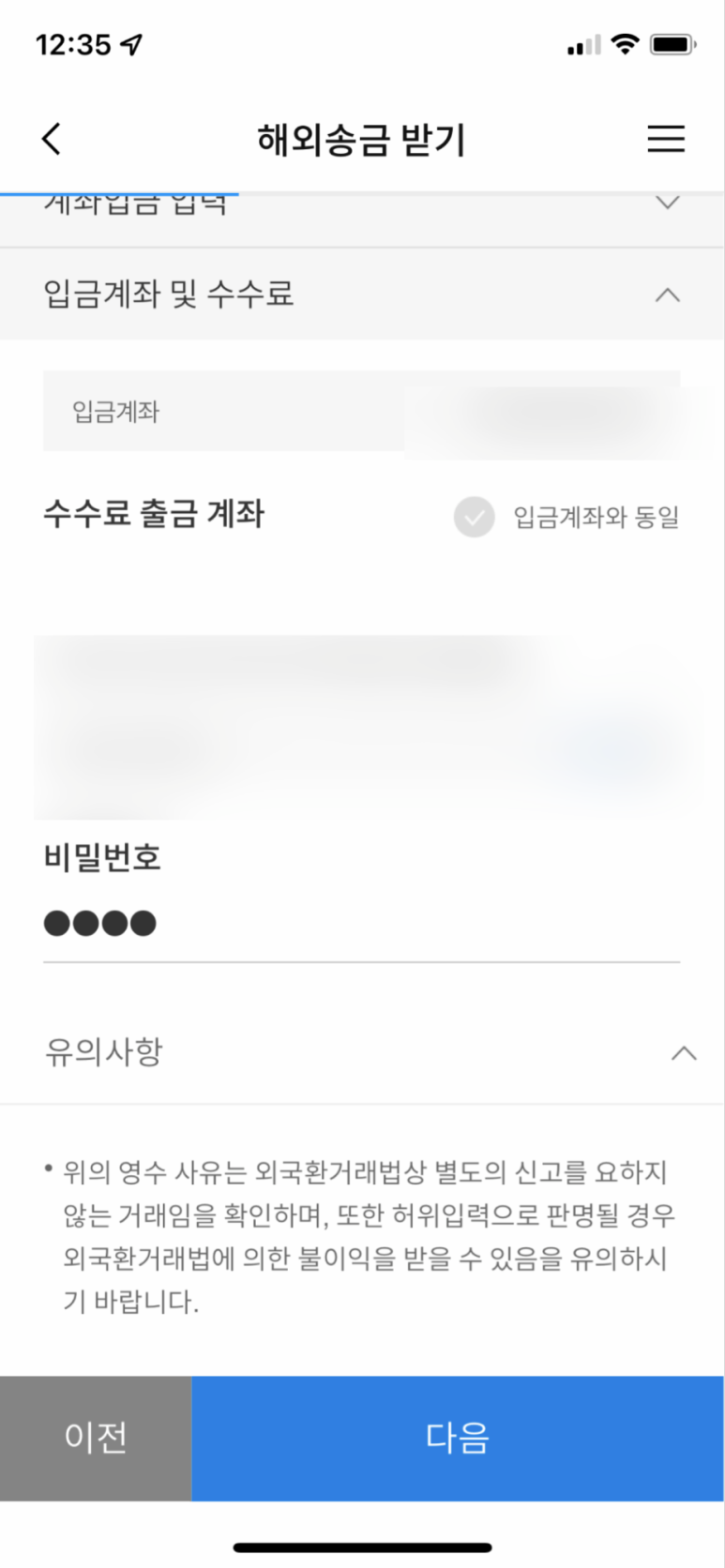 수수료 출금 계좌를 세팅하고 비밀번호를 입력합니다. 모두 세팅한 후 다음을 누릅니다.