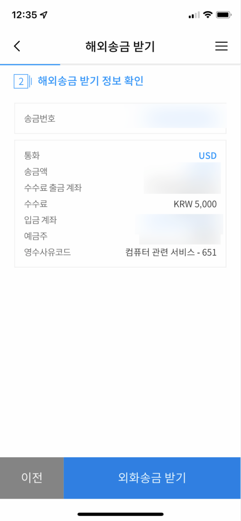 수수료는 5000원입니다. ‘외화송금’ 누르면 완료!