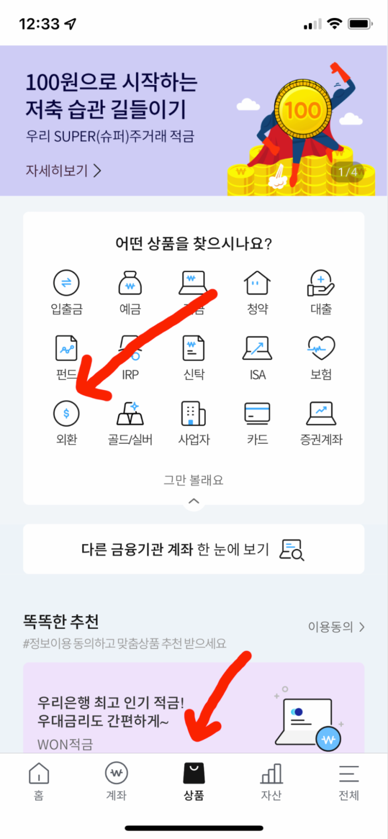 우리은행 원앱을 기동하여 상품->외환을 클릭합니다.