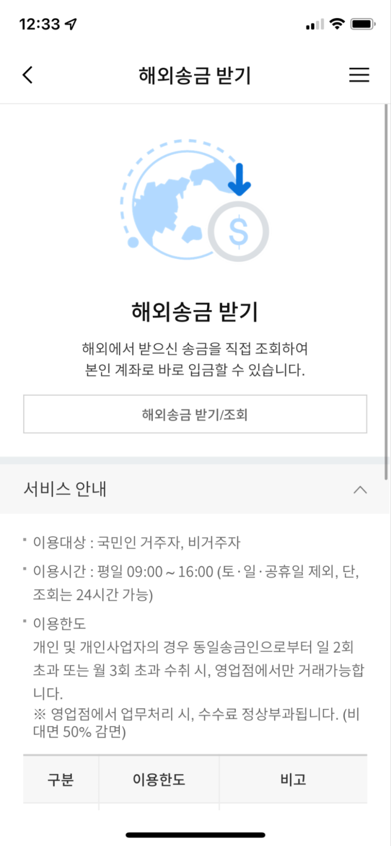 해외송금받는 #이용대상: 국민인 거주자, 비거주자 # 이용시간: 평일 09:00~16:00 (토, 일, 공유일 제외, 단 조회는 24시간 가능) # 이용한도의 개인 및 개인사업자의 경우 동일 송금인으로부터 일 2회를 초과하거나 월 3을 초과할 경우 영업점에서만 거래 가능합니다. 영업점 업무 처리 시 수수료가 정상적으로 청구됩니다.(비지원시 50% 감면)