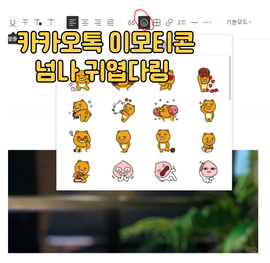 카카오톡 이모티콘을 사용할 수 있어서 좋다.나는 카카오톡 이모티콘이 너무 좋아.(네이버 스티커가 더 다양하긴 하지만) 카카오톡 이모티콘도 좀 더 다양해지고 구매도 할 수 있게 해준다면 정말 좋을 것 같다.