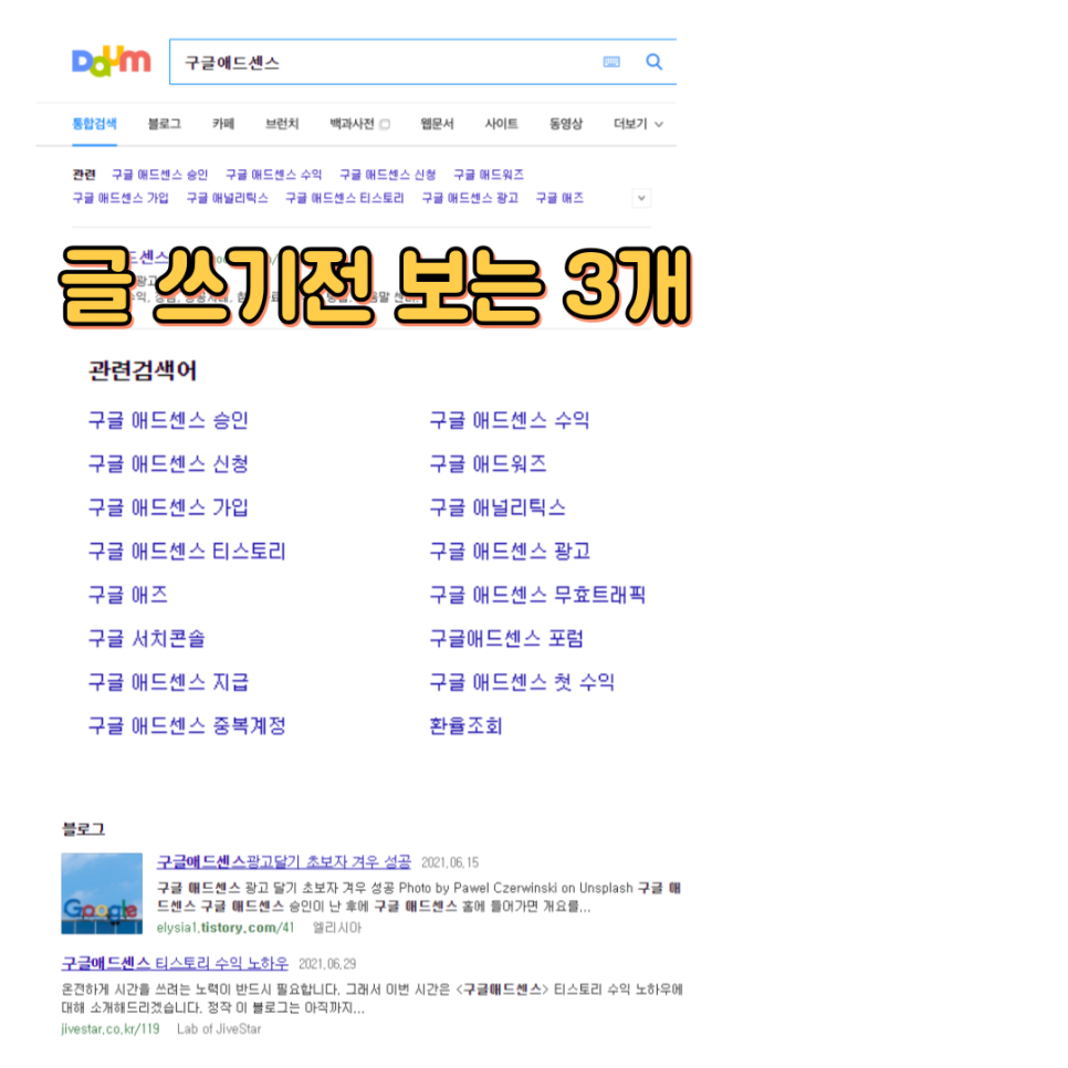 글을 쓰기 전에 이 세 가지는 꼭 보자 키워드를 잡을 때도 매우 중요한 요소인데, 예를 들어 구글 어드센스를 사용하고 싶다면 이를 그대로 다음에서 검색한 후 연관검색어, 연관검색어를 보고 키워드를 정한다.(만약 내가 구글에 상위 노출이 목표라면 구글 사이트에서 검색해 보는 것이 좋다)