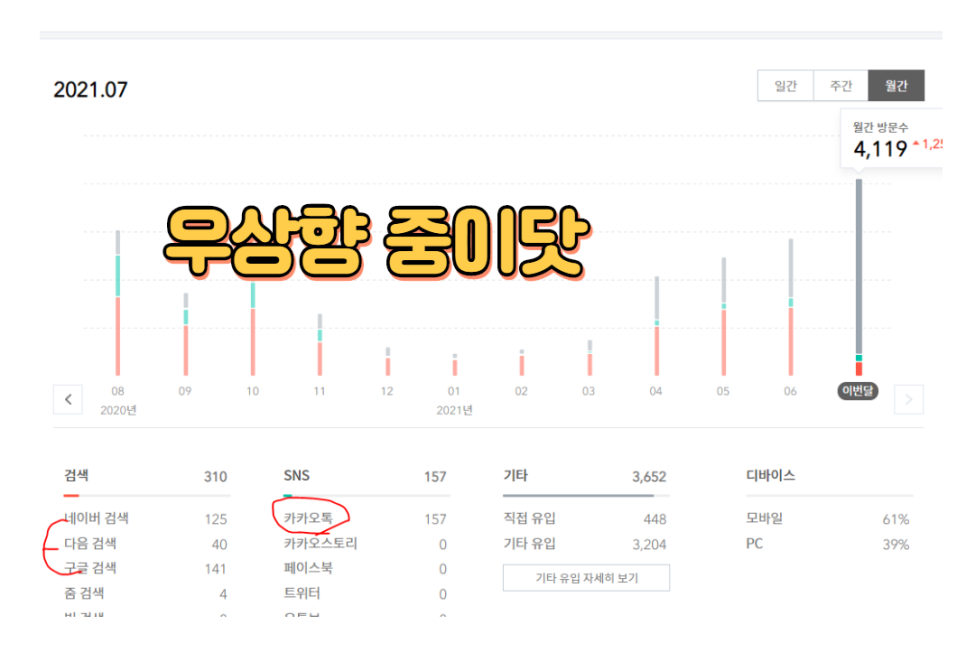 결국 내 티스토리가 성장해야 애드센스 수익이 생기는 방문자 수와 애드센스 수익이 비례하는 것은 아니지만 어느 정도는 맞는 말이기도 하다.