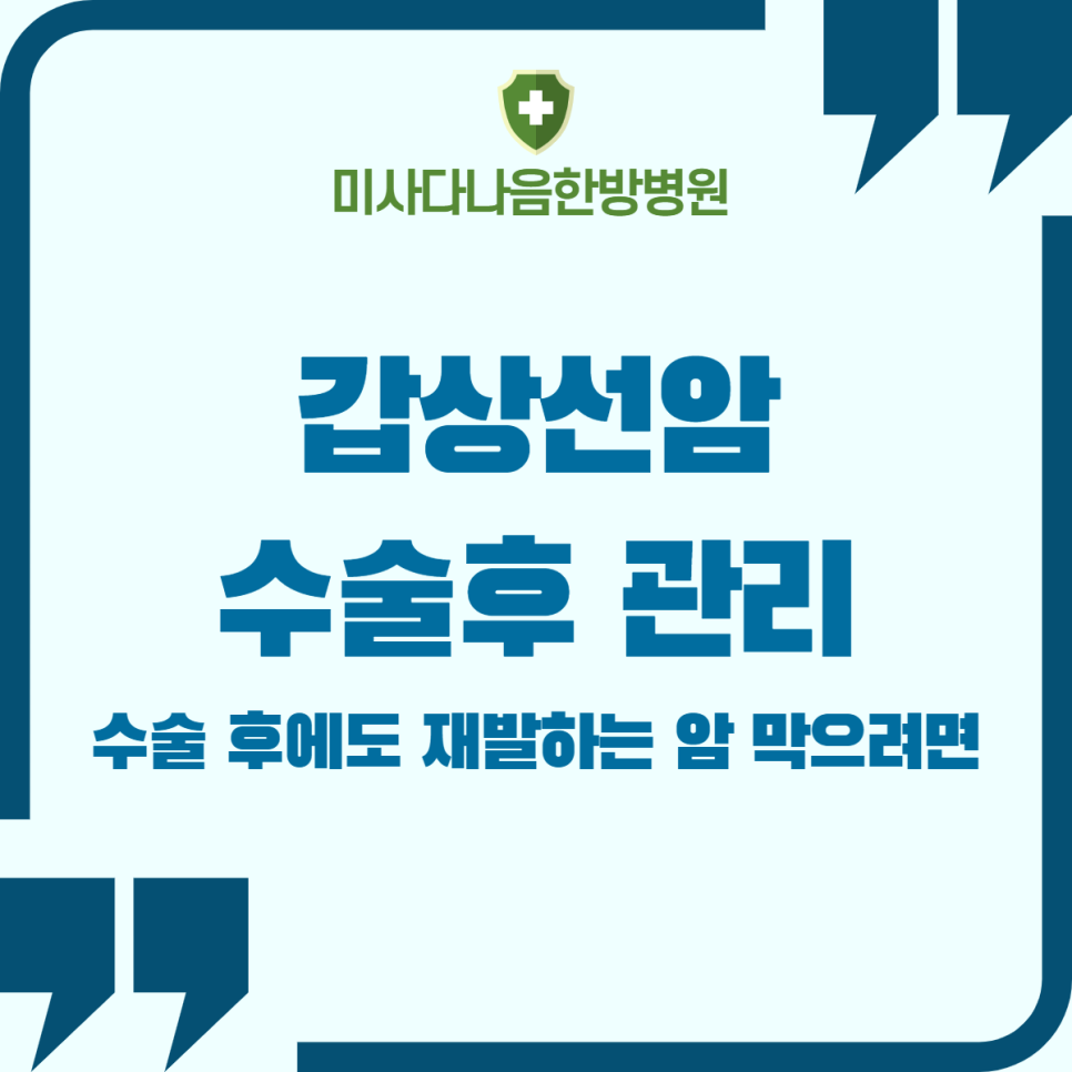 아래에 연락 주시면 갑상선암 수술로 인한 부작용, 갑상선암의 재발 확률을 낮출 수 있는 면역 치료에 대한 상담을 도와드리겠습니다.미사다나움과 함께 갑상선암. 현명하게 극복해 나가길 바래요.미사다나움 한방병원 문의전화 : 031-792-7579 카카오톡 상담(클릭) 경기도 하남시 미사강변대로 60 THE 0604, 5층 갑상선암 수술 후 관리가 중요합니다.