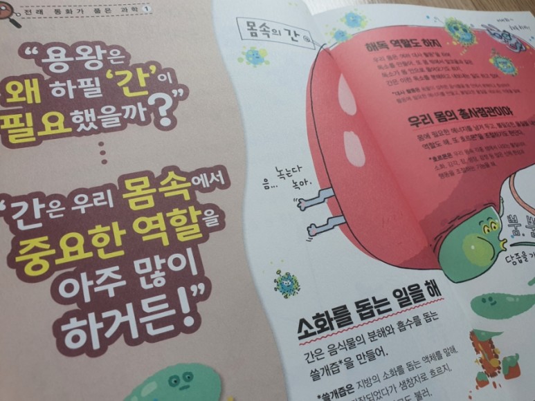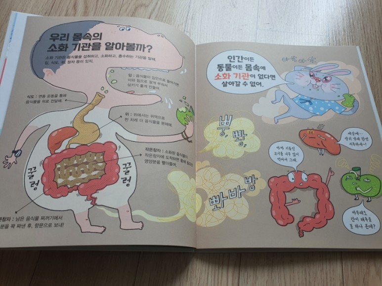 간 외에도 우리 몸의 소화 기관에 대해 알아 보도록 하겠습니다. 입부터 식도, 위, 작은 장, 큰 장의 역할과 방귀 메커니즘까지 그림과 송풍으로 즐겁게 배웁니다.앞에서 만난 것보다 진일보한 과학 내용까지 알차고 유익함이 가득했습니다.