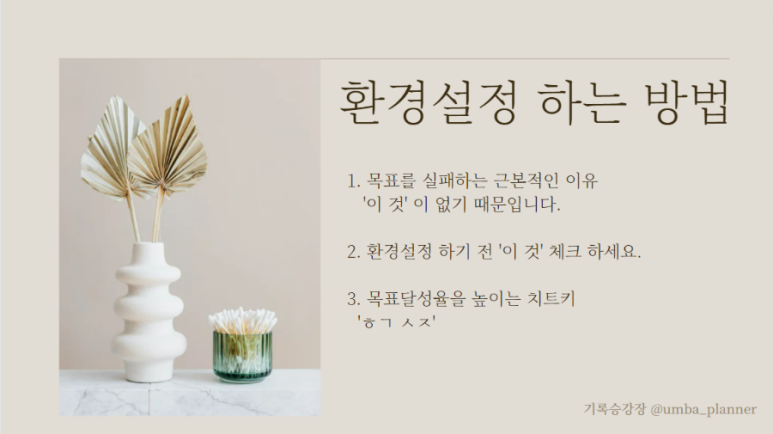 목표달성률을높이기위한다양한방법들이있는데저는환경설정이80~90%라고생각합니다. 더 잘할 수 있는 환경 속에 나를 두는 것은 작은 노력으로 큰 성과를 낼 수 있는 방법입니다 환경설정을 하기 전에는 자신을 게으르고 의지력이 약한 사람이라고 생각했습니다. 그러나 환경설정을 해 놓은 후에는 20-30%의 달성률을 70-80%, 많게는 100%까지도 올릴 수 있었습니다.