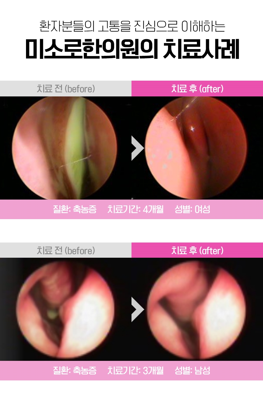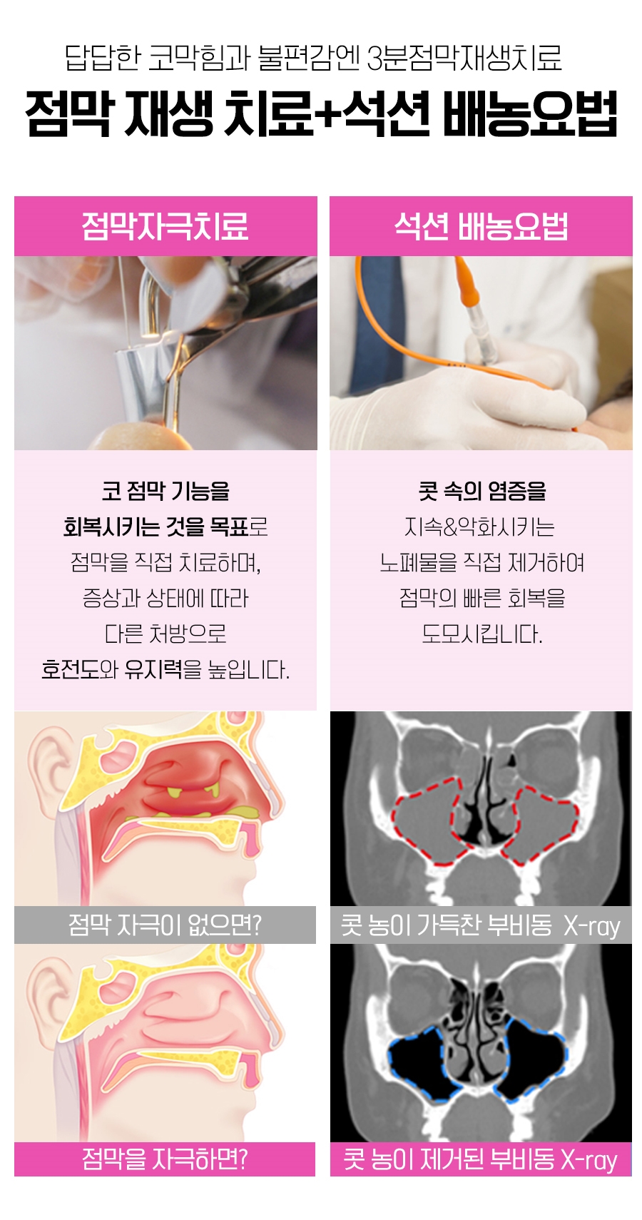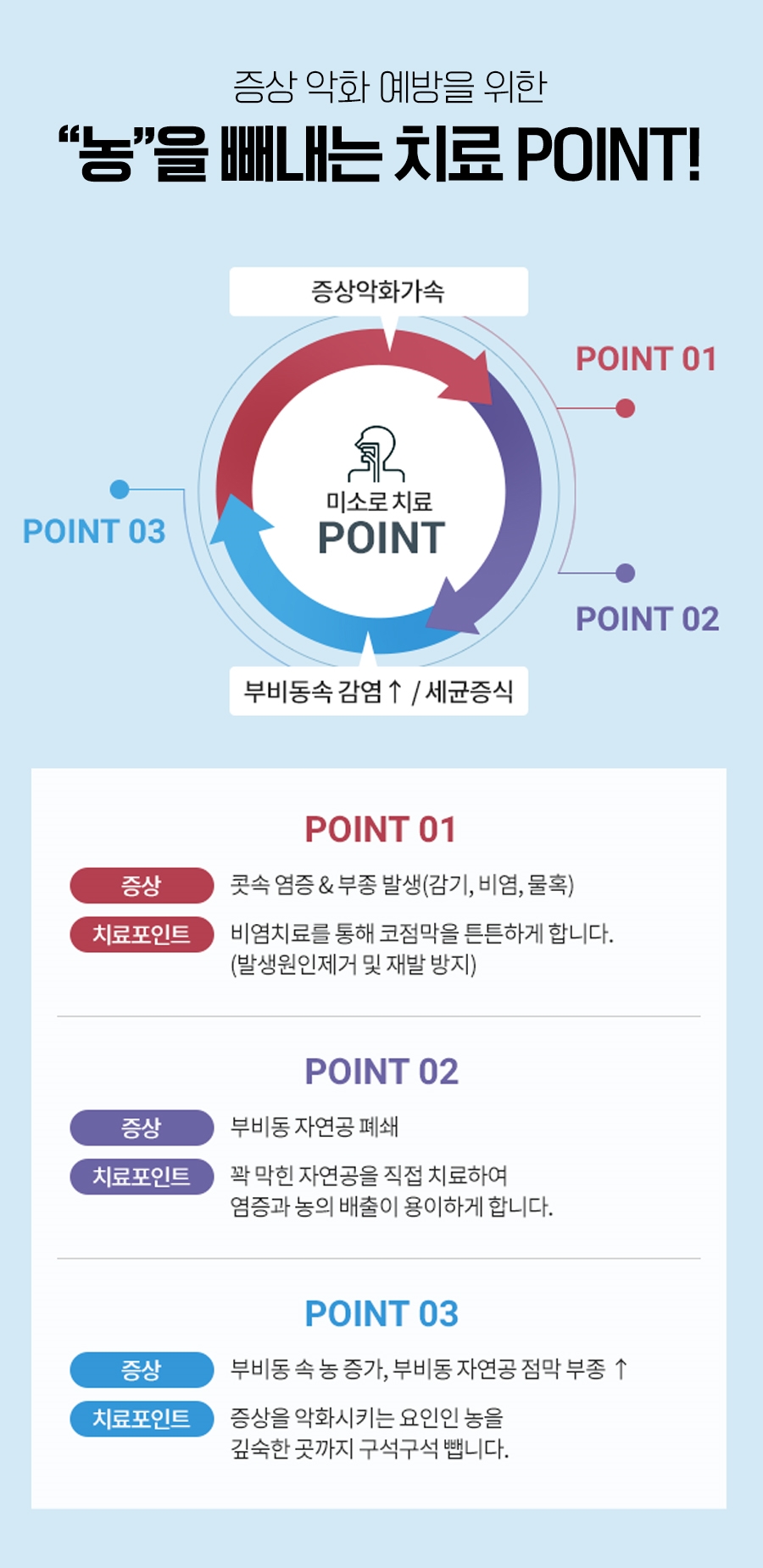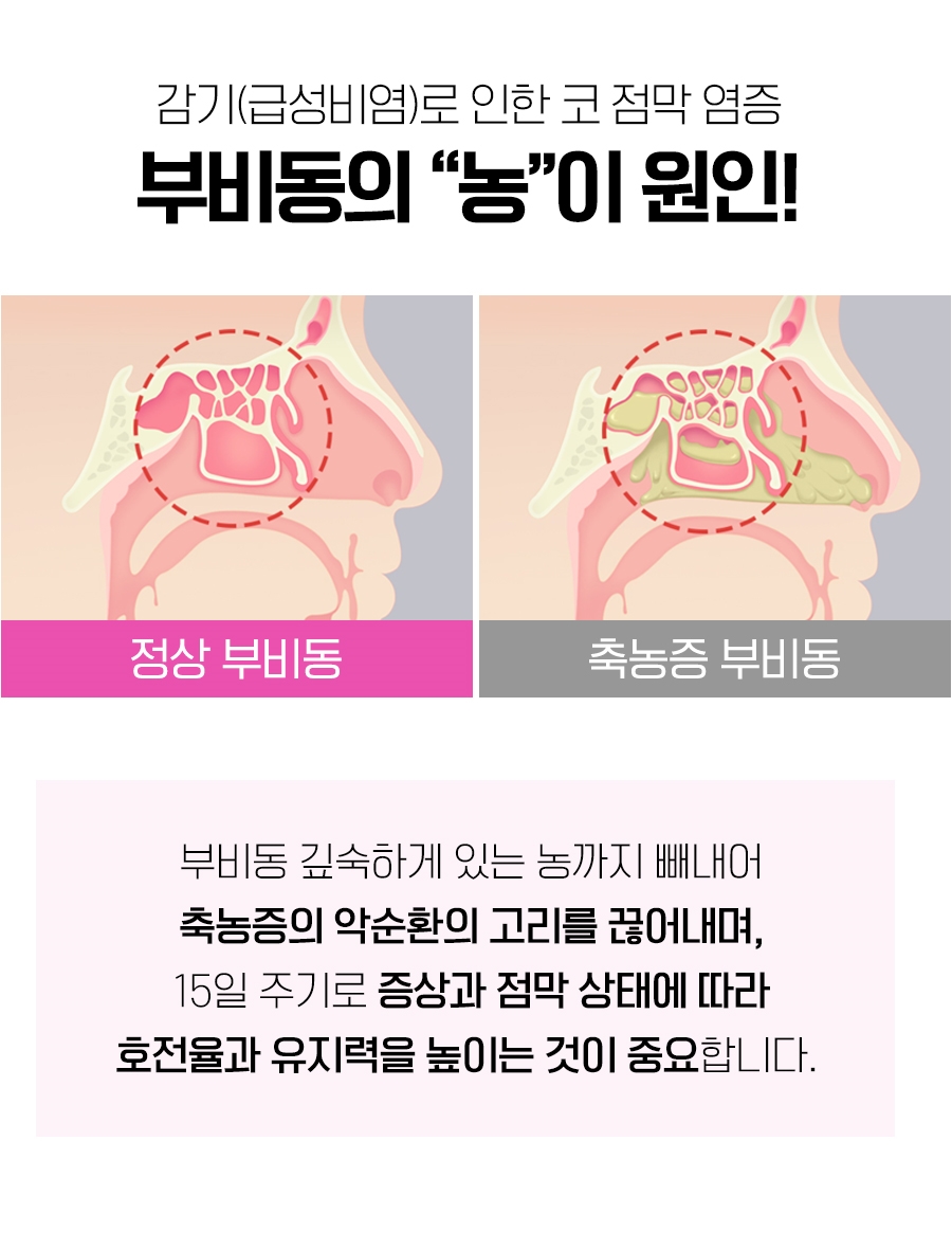 이런 경우에는 점막이 부어올라 비강과 부비강을 연결하는 자연공이 폐쇄되고 그로 인해 부비강까지 산소 유입이 어려워지면서 pH의 농도가 변화하기 때문에 자연스럽게 섬모조직의 기능이 저하되어 농과 노폐물의 방출이 불가능하게 되어 축척될 수밖에 없었습니다.
