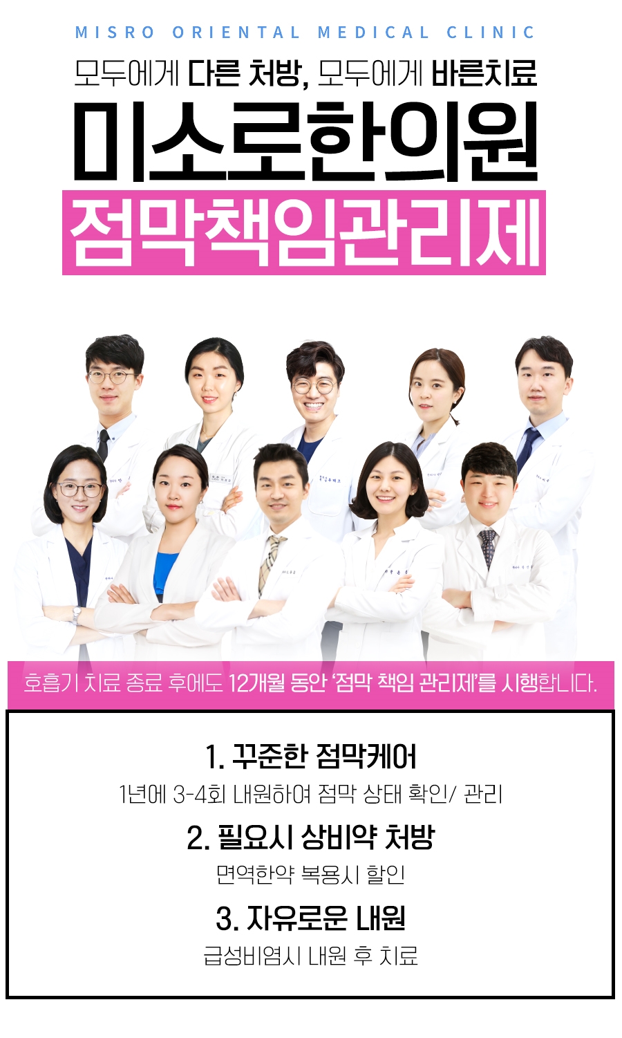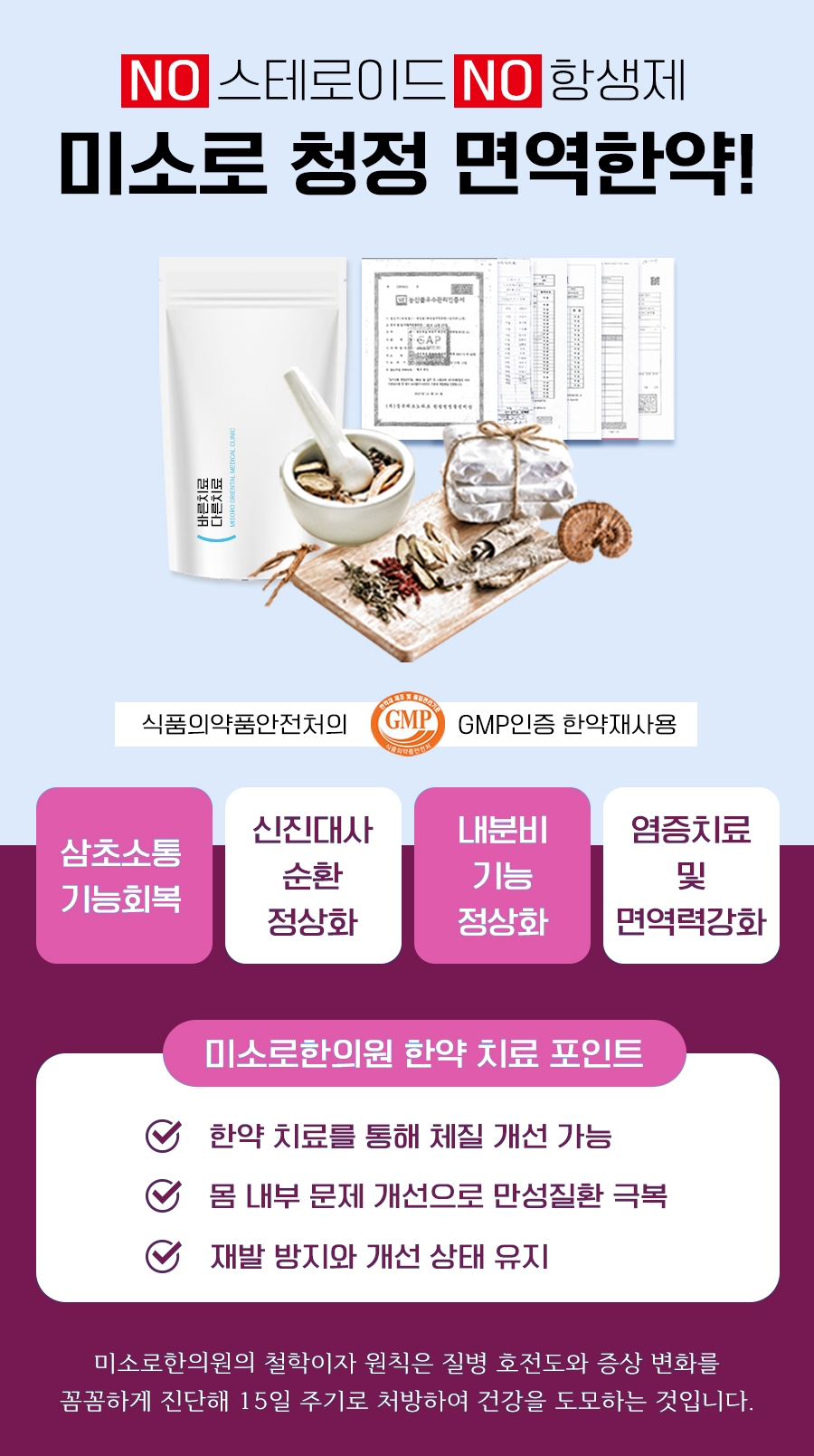 그동안 다양한 환자분들을 진료하고 오랜 임상을 통한 것을 바탕으로 일대일 맞춤형 문진을 통해 개인의 건강생태와 원인, 체질 등을 종합적으로 고려하여 일대일 처방을 하였습니다.