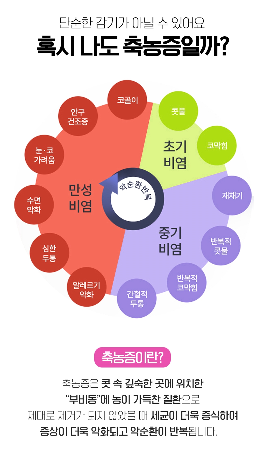 특히 이는 평소 비강에 특별한 이상이 없었던 사람이라도 감기에 걸린 직후 주요 증상이 호전될 기미를 보이지 않고 동시에 안면압통까지 동반하게 되면 축농증을 충분히 의심해볼 수 있었습니다.