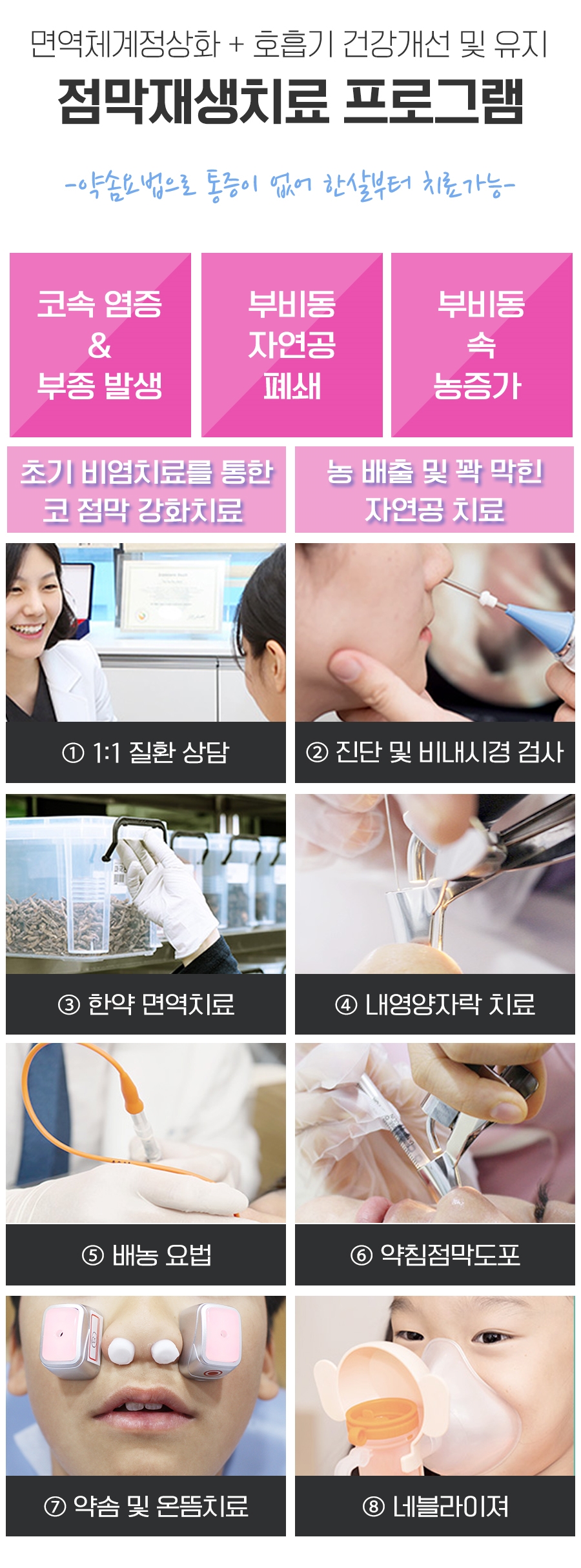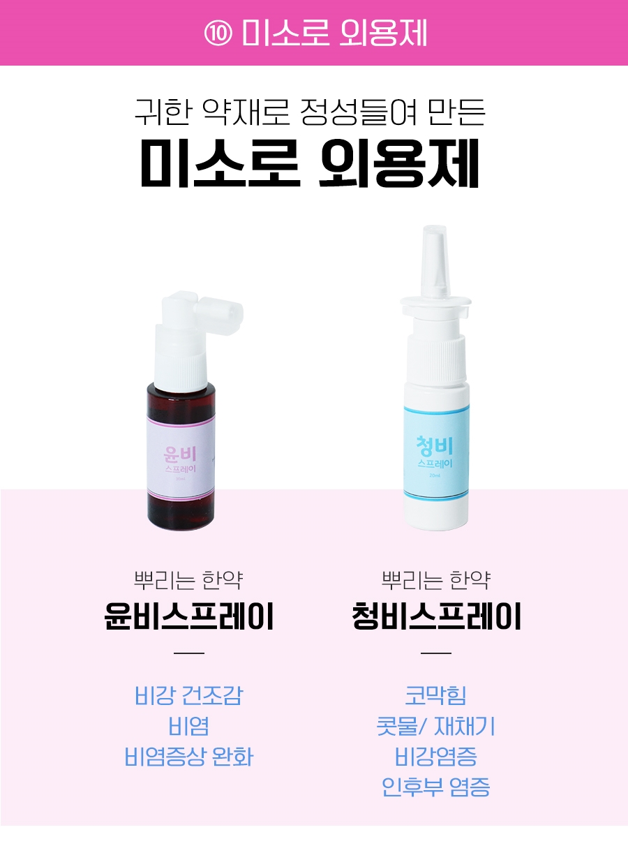 단계적이고 섬세한 관리를 통해 부비강 내부의 염증을 가라앉힌 후 점막을 튼튼하게 보강할 수 있도록 염증에 대한 저항력과 보호능력을 키우는 케어를 적용하였습니다. 또한 신체의 전반적인 면역력을 향상시킬 수 있도록 합니다.