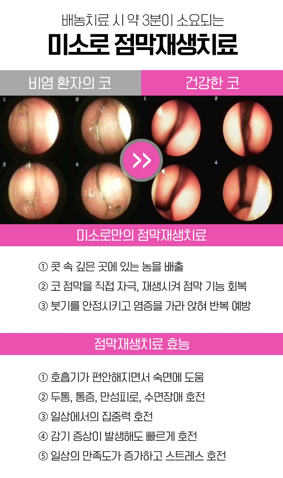 이는 염증이나 콧속의 고름을 일시적으로 완화하는 획일적인 관리가 아니라 점막의 세포를 강화하도록 해 항알레르기와 항염증의 기능이 자연스럽게 탑재되도록 돕는 큐어로 볼 수 있었습니다.
