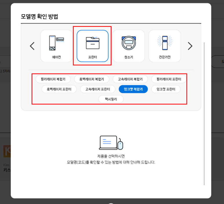 이걸 클릭하면 새로운 창이 뜨고 삼성의 다양한 제품군에 대한 ‘모델명 확인 방법’이 나올 것입니다. 여기에는 휴대폰으로 시작해서 태블릿, 웨어러블, 컴퓨터까지 다양한 형태의 기기가 구분되어 있습니다. 이중에오른쪽에있는화살표를눌러서옆으로넘기면우리가찾고있는프린터에대한내용도있습니다. 이것을 선택하면 아래쪽에 어떤 프린터 or 복합기를 보는지 체크하게 되어 있어요.