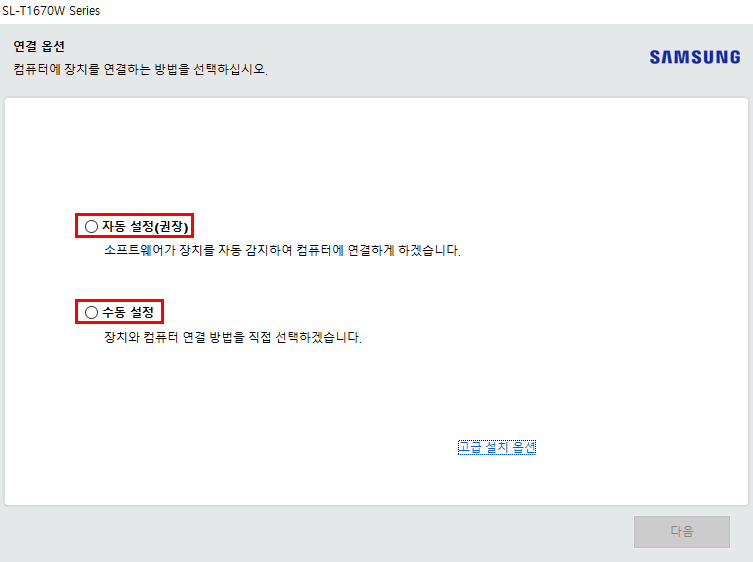 이렇게 삼성복합기 운전자 다운로드가 끝나면 복합기를 어떻게 연결하는지 체크하게 됩니다. 이때 이것은 특별한 설정 없이 무선으로 ‘자동 감지’를 하는 방법도 있고 수동으로 직접 연결하는 방법도 있습니다. 어느쪽이든선택해서연결해보세요. 이상 삼성 프린터, 복합기 드라이버 다운로드 및 설치 방법에 대해 알아봤습니다.