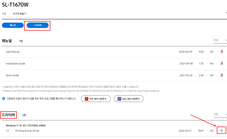 이때 위의 메뉴를 보면 매뉴얼, 드라이버 두 개의 목록이 구분되어 있습니다. 이 중에서 「매뉴얼」옆에 있는 「드라이브」를 클릭하면, 메뉴얼아래에 「프린트 드라이브」전용 메뉴가 새롭게 표시됩니다. 여기서 본인의 OS 버전을 확인하고 오른쪽에 있는 다운로드 버튼을 누르면 설치 파일을 받을 수 있습니다.