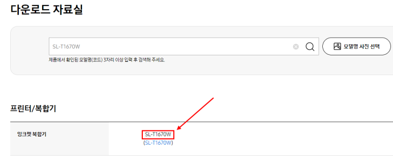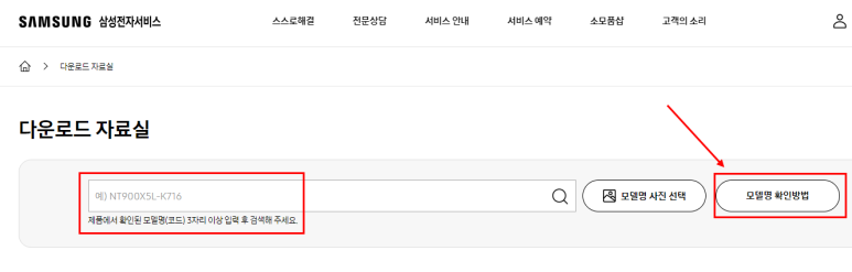 이걸 누르면 다음 페이지 가운데에 모델명을 쓸 공간이 나옵니다. 여기에 가지고 계신 삼성 프린터 또는 삼성 복합기의 모델명을 써 보세요. 이때 가끔 본인이 가지고 있는 제품의 ‘모델명’이 어떤 것인지 모를 때가 있습니다. 그 때는 오른쪽에 있는 ‘모델명 확인 방법’이라고 적힌 것을 클릭하면 되는데,