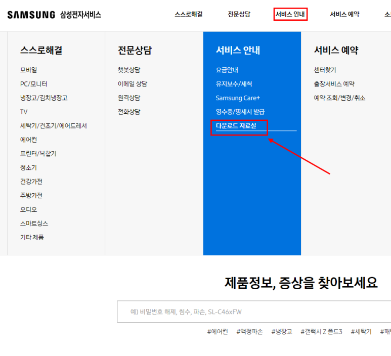 이것은 ‘삼성전자 서비스’ 홈페이지에서 받으실 수 있습니다. 검색을 통해 이곳에 들어오면 다양한 제품에 대한 정보가 나타납니다. 여기서 다른 것이 아니라 위쪽에 ‘서비스 안내’라고 적힌 메뉴를 클릭해보세요. 자,그럼아래쪽에세부메뉴가나오는데그중에서다운로드자료실이라고되어있는것을눌러보세요.