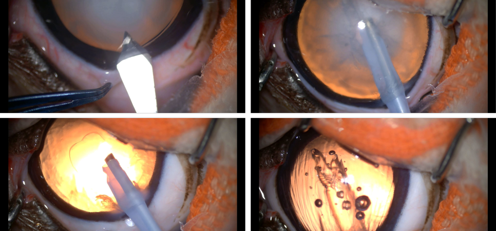 사진과 같이 각막을 절개하고 눈 속에 기구를 삽입하여 수정체내의 단단해진 백내장을 초음파로 녹여 흡인, 제거합니다.백내장 물질이 눈에서 사라졌기 때문에 정상적인 주황색 반사가 밝아 보이는 것을 확인한 후 인공렌즈를 눈 속에 서서히 펼쳐 삽입합니다.