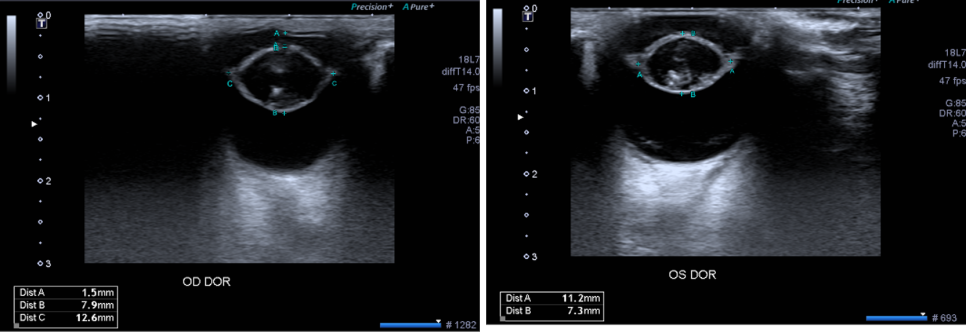추가로 안과 초음파 검사를 실시하였습니다. 검사상 백내장이 확인되었고, 백내장 뒤쪽에 미약한 초자체 변성이 확인되었습니다.그 외에 특이사항은 없었습니다.