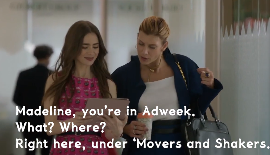 Madeline, you’re in Adwee k. , ‘애드윅’에 뜬 것 같아요.What? where? 정말? 어디? Right here, under’ Movers and shakers.’ 여기 푸를옹서 소개 칼럼입니다.