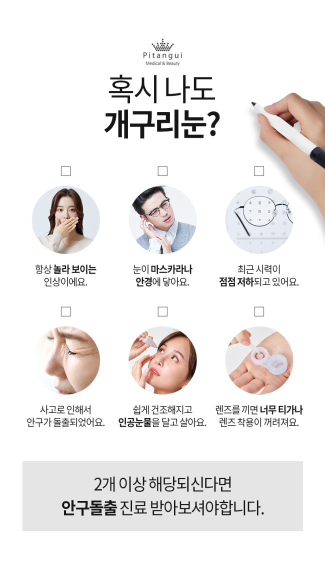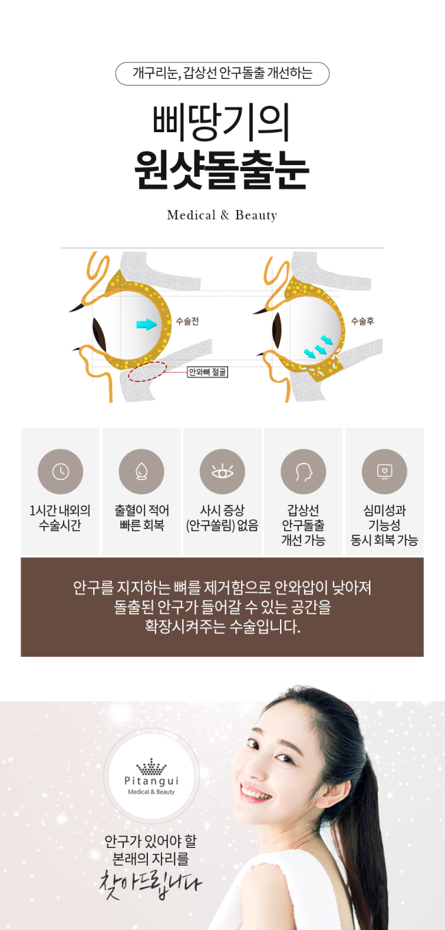 만약 눈꺼풀 변형이 심한 경우라면 다른 눈 성형과 함께 안구 돌출 수술을 하여 튀어나온 눈의 개선이 가능합니다.