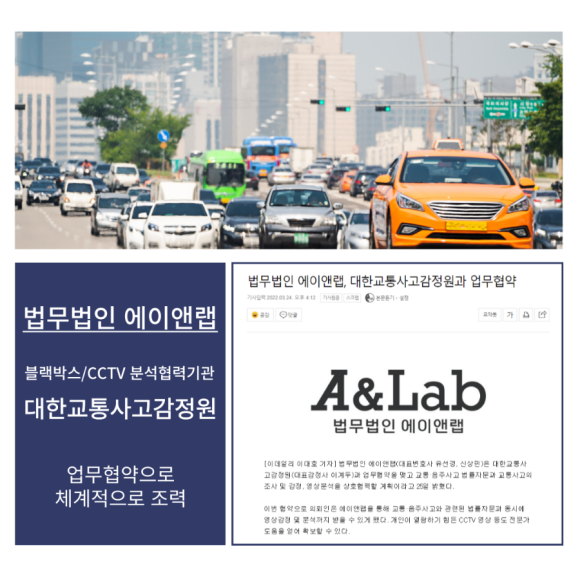 교통관련 사안은 당시 도로상황(노면상태, 주변차량의 움직임)도 매우 중요한 증거자료이므로 해당 자료를 보다 정확하게 검토하기 위하여 교통사고감정원과 협업하여 블랙박스 영상 등을 분석하고 있습니다.