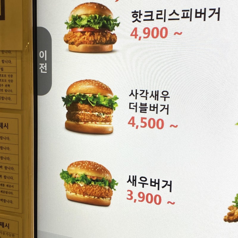 사각새우데이로 단품이 5,300원이던 롯데리아 사각새우 더블버거가 3,500원이어서 햄버거에 따로 음료를 추가해 선택해줬다.기존 세트 가격은 7,300원, 감자튀김과 음료까지 포함된 칼로리는 951kcal였다.얌이는 할인이 적용되는 햄버거만 골라서 여기에 불고기버거를 하나 더 골라봤다.음식이 나오기 전에 매장을 둘러보고 한쪽 구석에 자리를 잡았다.