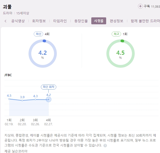 현재 시청률은 최고 4.4%입니다. 이 정도 시청률도 좋을 것 같아요. 밤 11시라는 늦은 시간에 방영, 그리고 비지상파. 가볍게 보기에는 무리한 드라마 분위기와 다소 어렵고 애매한 대사들이 이탈하는 시청자들을 만들지 않았나 싶습니다. 괴물은 한마디로 진입 장벽이 있는 드라마로 보입니다.